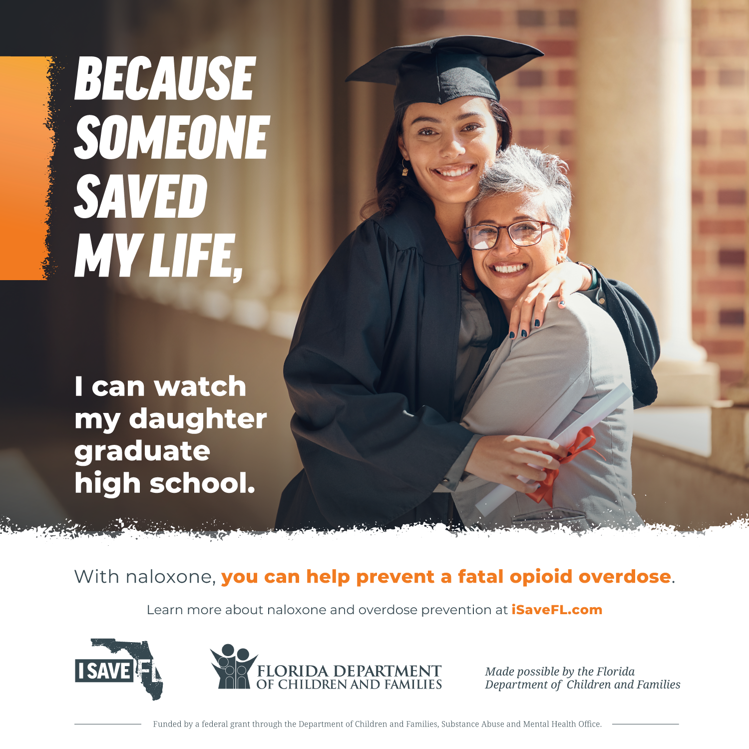Suggested copy: Saving someone’s life with naloxone gives them a second chance to show up for their loved ones. Visit isavefl.com to find free naloxone near you. #GetNaloxone #SaveALife