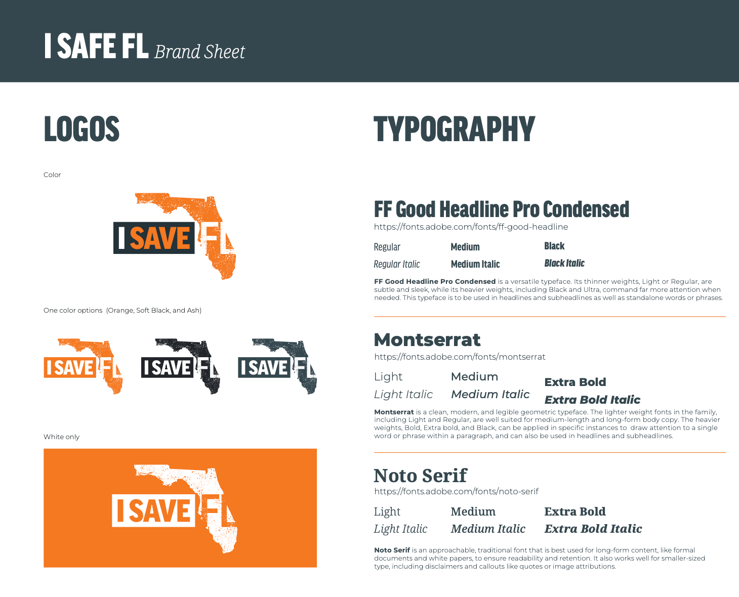Guidelines for proper use of the iSaveFL logo, typography, and color palette.